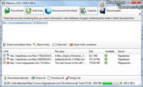 Mipony – to bezpłatny menadżer pobierania plików stworzony głównie z myślą o serwisach hostingowych. Program wspomaga ściąganie plików z między innymi z takich serwisów jak : Megaupload, Rapidshare, Hotfile, Easy-share, Gigasize, Mediafire, Depositefiles, Megaporn, Filefactory, Uploading, 4shared, Sendspace, Gigasize i wielu innych 😀 ( pełną listę obsługiwanych serwisów znajdziecie tutaj )