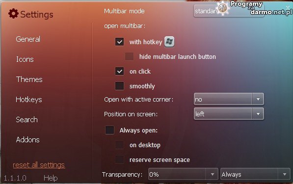 Multibar pozwala na zmianę skórek, ikon, położenia paska, przeźroczystości i wiele więcej.Obsługa ( konfiguracja ) programu jest bardzo prosta, za sprawą bardzo intuicyjnego interfejsu.
