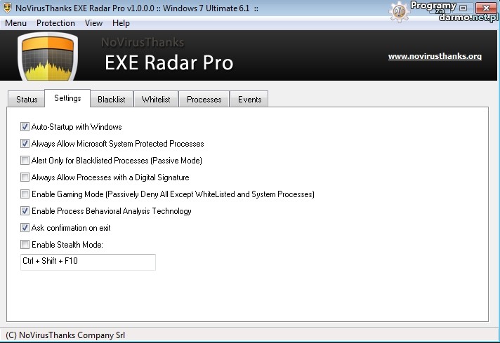 – tryb ukryty ( który można wykorzystać aby całkowicie ukryć okno główne NoVirusThanks EXE Radar Pro i ikony, użytkownik może zdefiniować własne skróty aby uruchomić ten tryb.