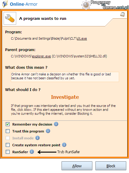 W przypadku uruchomienia nieznanej aplikacji zostaniemy o tym niezwłocznie powiadomieni przez Online Armor stosownym komunikatem. Znajdziemy w niej  pełna informację dotyczącą programu który próbuje się uruchomić, możemy zezwolić lub zablokować to działanie, zapamiętać decyzję oraz dodać program do zaufanych.