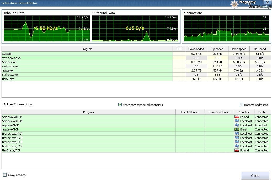 Jak przystało na dobry firewall Online Armor Premium posiada graficzny monitor sieci szczegółowo informujący nas w czasie rzeczywistym o aplikacjach które wysyłają i odbierają dane.