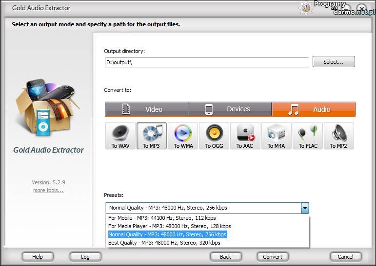 Gold Audio Extractor – jest łatwym w obsłudze narzędziem które pozwala konwertować pliki wideo (wszystkie popularne formaty) do formatów audio takich jak MP3, WAV, WMA, OGG, itp.