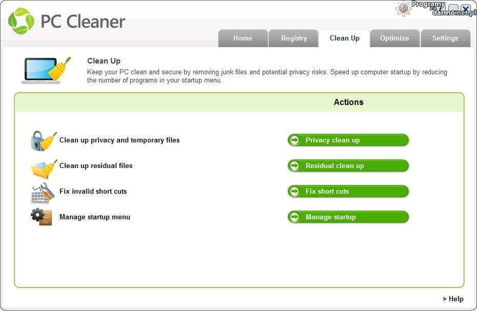 PC Cleaner pozwala oczyścić rejestr systemu Windows ze zbędnych lub błędnych wpisów, usunąć pliki tymczasowe tworzone przez różne aplikacje które niepotrzebnie zajmują miejsce na dysku, naprawić błędne skróty, zoptymalizować system aby działał płynniej i stabilniej, zarządzać autostartem i wiele więcej.