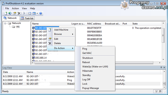 Dostępne akcje na zdalnych komputerach: Zamknij, uruchom ponownie, hibernacja, w stanie spoczynku (tryb uśpienia), Wyloguj, Zablokuj, budzenie (Wake-on-LAN), wiadomość Popup.