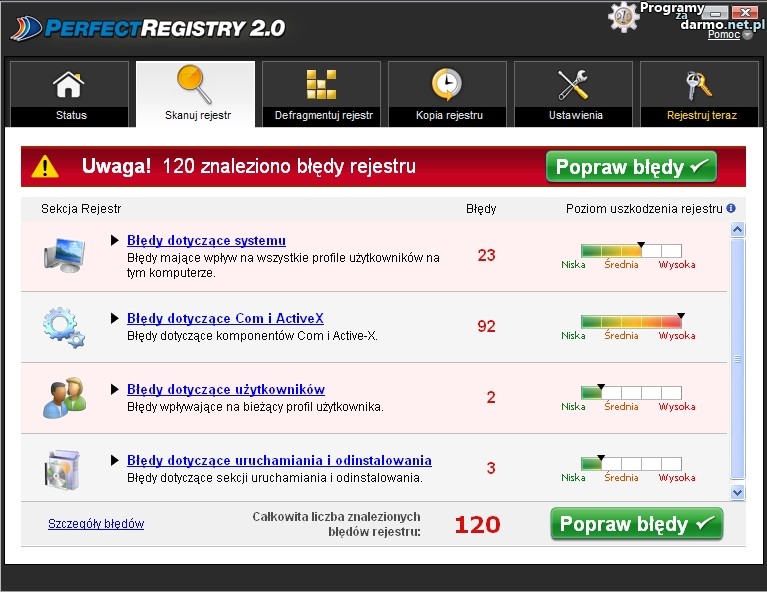 Przy pierwszym uruchomieniu program automatycznie przeskanuje rejestr w poszukiwaniu błędów i wyświetli znalezione problemy: