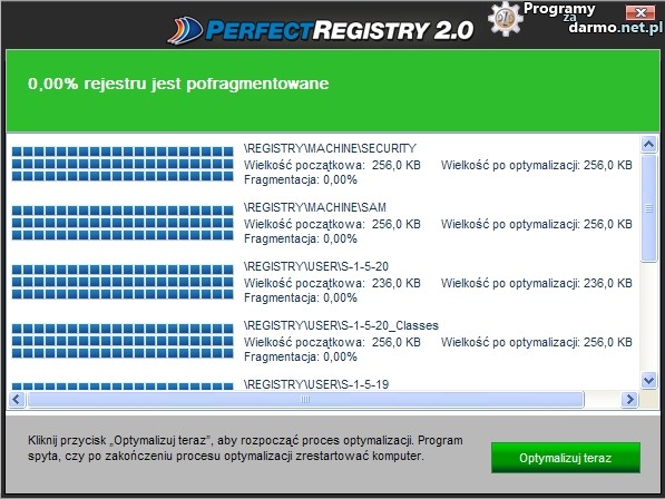 Aby wykonać defragmentację/optymalizację klikamy Optymalizuj... i czekamy aż program sprawdzi i wyświetli jak bardzo pofragmentowany jest nasz rejestr: