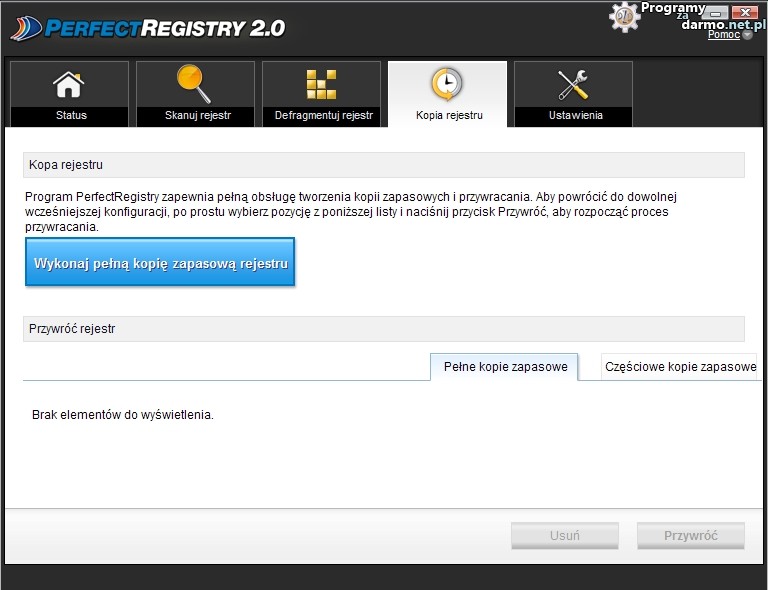 Kolejna zakładka to tzw. koło ratunkowe czyli kopia rejestru, aplikacja w kilka sekund wykonuje pełną kopię rejestru i w takim samym czasie może ją przywrócić jeśli coś pójdzie nie tak (przed każdym czyszczeniem PerfectRegistry wykonuje kopię częściową- czyli tylko wpisy usuwane):
