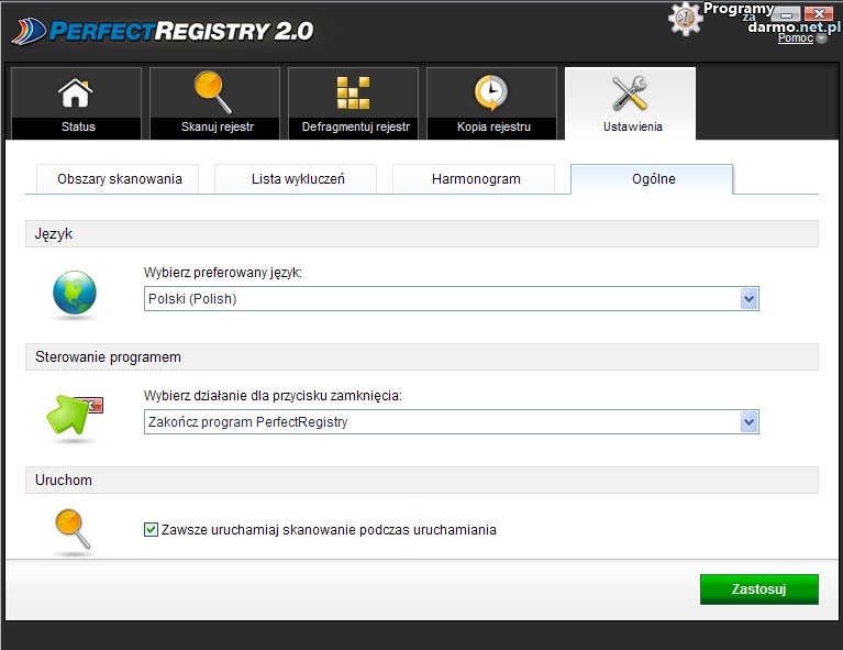 – ogólne– gdzie mamy możliwość wybrania wersji językowej programu, ustawienia odpowiedniej akcji do przycisku zamknięcia, a także ustawienia skanowania rejestru przy każdym starcie systemu: