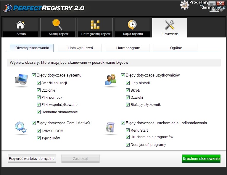 – obszary skanowania– wybieramy obszary rejestru które ma przeszukiwać program (domyślnie zaznaczone wszystkie):