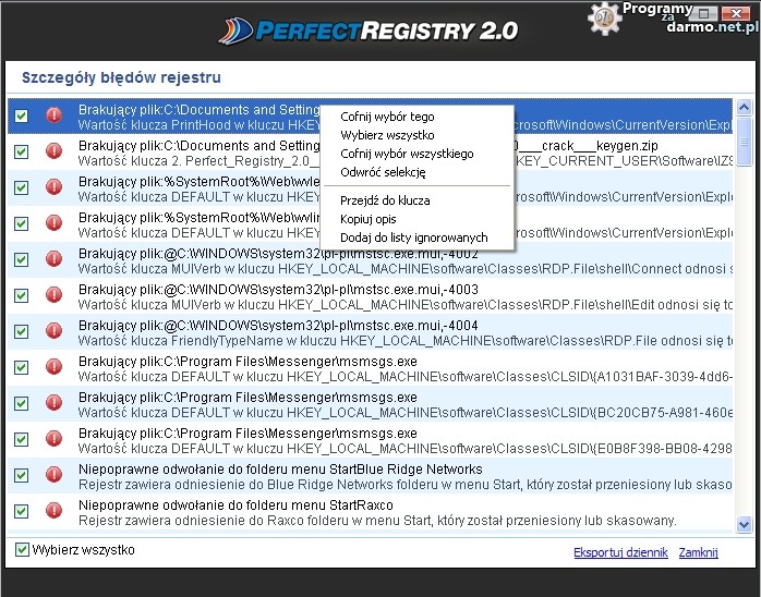 Na tej karcie mamy możliwość przejrzenia znalezisk programu, wybrania odpowiednich wpisów do usunięcia czy też pozostawienia w systemie i eksportu dziennika do pliku. Menu kontekstowe oprócz standardowych opcji typu cofnij, wybierz oferuje ciekawą opcję podglądu każdego znalezionego wpisu poprzez systemowy edytor rejestru- możemy sprawdzić czy klucz naprawdę istnieje i czy program nie robi nas w „bambuko”.