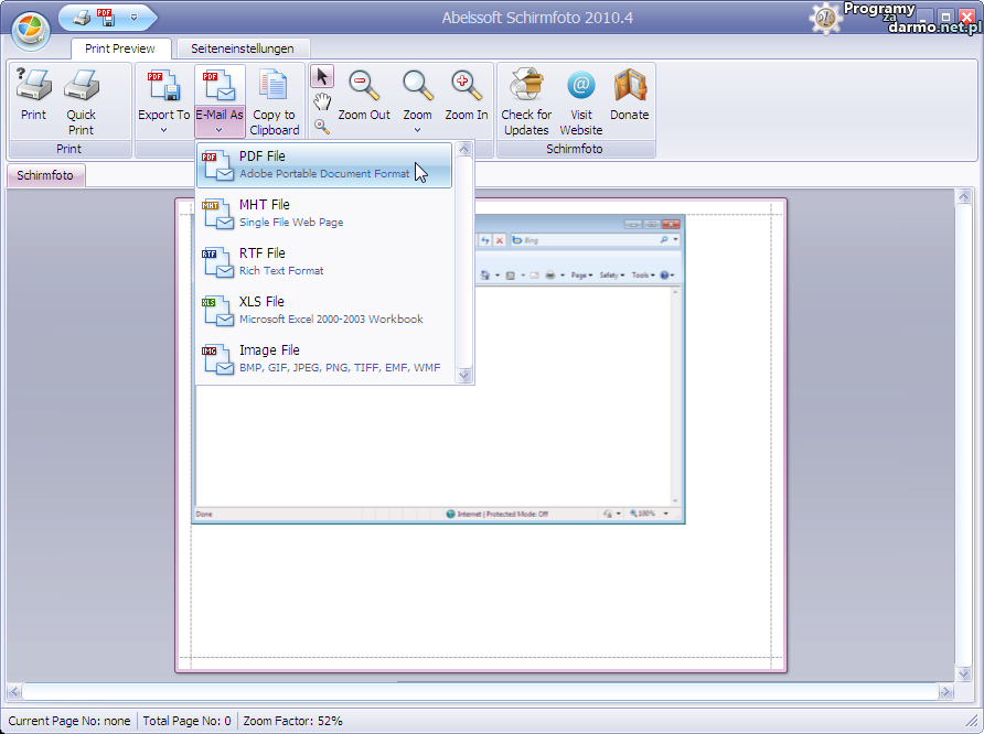 Schirmfoto zachowa efekty naszej pracy w takich formatach jak PNG, JPG, RTF czy PDF.Program posiada narzędzia przyspieszające drukowanie czy wysyłanie stworzonych obrazów przy pomocy poczty e-mail,dodatkowo Shrimfoto umożliwia nam dodawanie znaków wodnych do zrzutów ekranu.