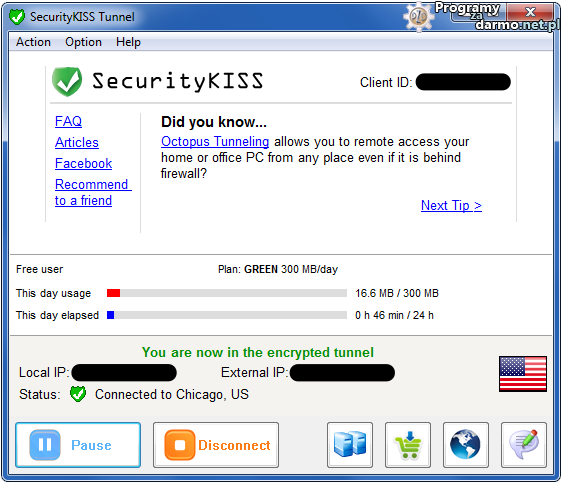 SecurityKISS – to kolejna usługa która pozwala zachować anonimowość podczas codziennego surfowania w internecie.W darmowej wersji mamy do wykorzystania 300 MB transferu dziennie ( 300MB na 24 godziny ) co spokojnie wystarczy do przeglądania stron itp.