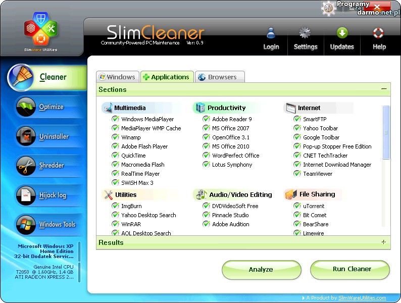 SlimCleaner posiada bardzo intuicyjny Interfejs dzięki czemu obsługa programu jest bardzo prosta.Program jest w języku Angielskim.Obsługuje systemy Windows 7 ,Vista i XP. 🙂