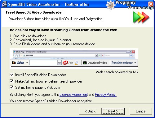 W trakcie instalacji można dodatkowo wybrać możliwośc zainstalowania niedawno opisywanego SpeedBit Video Downloader’a dzięki któremu można pobierać treści wideo. Od siebie mogę natomiast dodać, iż zalecane jest odznaczenie ustawienia defaultowej wyszukiwarki Ask.com, aby nie było później problemów.