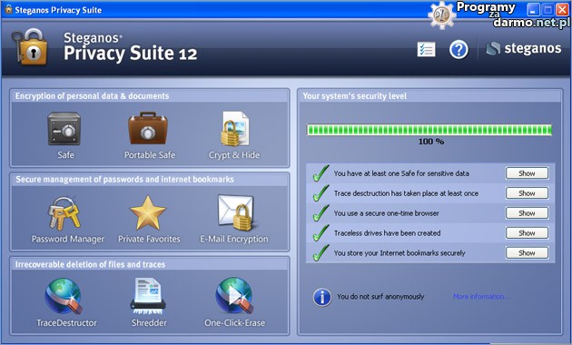 Moduł Portable Safe umożliwia tworzenie przenośnych zaszyfrowanych archiwów, można je zapisać na CD/DVD lub pamięci przenośnej USB. W pakiecie znajdziemy także niszczarkę plików, która zapewnia skuteczne usuwanie danych tak aby ich odzyskanie nie było możliwe.Steganos Privacy Suite 12 stanowi połączenie najlepszych programów firmy Steganos.