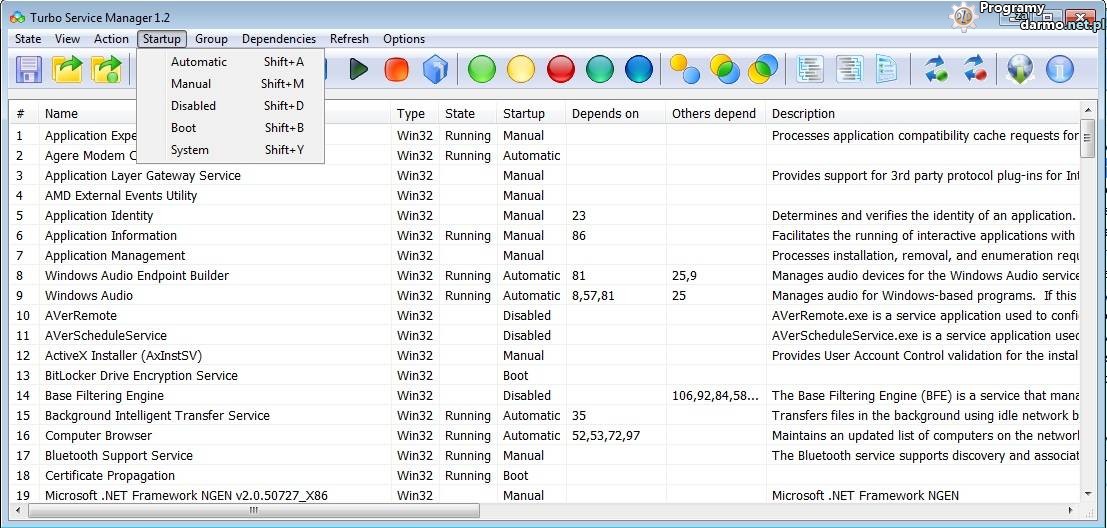 Turbo Service Manager – to bezpłatne narzędzie przeznaczone do konfiguracji usług w systemach Windows.Za pomocą tego programu możemy wyłączyć, włączyć, wybrać w jaki sposób mają być uruchamiane, zatrzymać, uruchomić ponownie wiele wybranych usług na raz za jednym naciśnięciem klawisza.