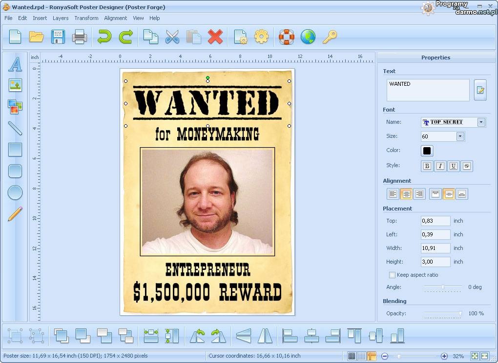 RonyaSoft Poster Designer – to prosta w obsłudze aplikacja służąca do szybkiego i łatwego projektowania i drukowania atrakcyjnych niestandardowych plakatów, banerów i szyldów. Oprogramowanie jest dostarczane z kolekcją gotowych do użycia szablonów.