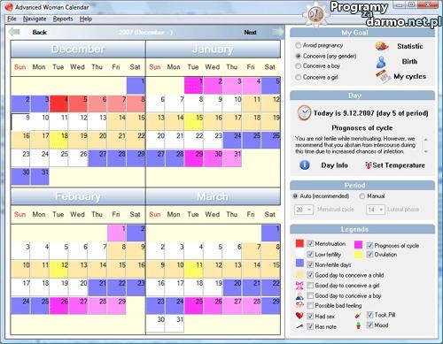 Advanced Woman Calendar – to łatwy w obsłudze kalendarz dla kobiet. Kalendarz oblicza dni cyklu wysokiego i niskiego ryzyka zajścia w ciąże tym samym zapobiegają niechcianemu zapłodnieniu lub odwrotnie. Program również pomaga zwiększyć szanse poczęcia dziewczynki lub chłopczyka.