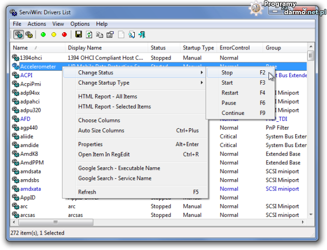 ServiWin – bezpłatne narzędzie które wyświetla szczegółowe informacje o zainstalowanych sterownikach i usługach.Program wyświetla opis pliku, nazwę produktu, nazwę producenta, wersję, status sterownika/usługi, informacje o rozruchu oraz informację o błędach. ServiWin nie tylko wyświetla informacje o sterownikach i usługach ale także pozwala nimi zarządzać, możemy zatrzymać , uruchomić, zrestartować, wstrzymać sterowniki/usługi , zmienić sposób uruchamiania czy zapisać konfigurację do pliku.