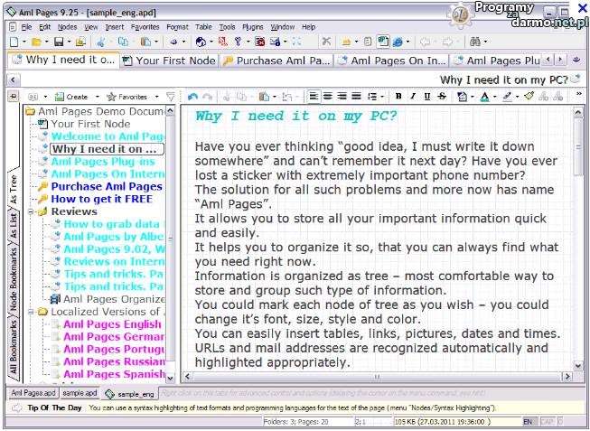 Aml Pages to program który umożliwia organizowanie wielu krótkich informacji (notatki, strony WWW, hasła, wiadomości e-mail czy adresy URL) w niezwykle przejrzysty sposób, dzięki czemu wszystkie twoje zapiski będą zawsze pod ręką.