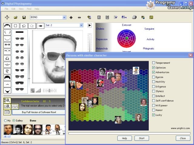 Digital Physiognomy – to bardzo ciekawy program do sporządzania portretów pamięciowych drogą zestawiania i doboru szczegółów anatomicznych twarzy, dostępnych w bazie programu.