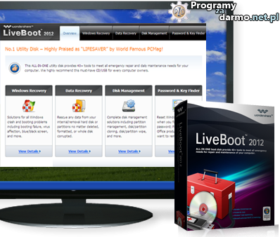 Wondershare LiveBoot 2012 – to zestaw ponad 40 narzędzi które mogą się okazać bardzo przydatne w przypadku gdy komputer odmówi nam posłuszeństwa.Znajdziemy tutaj narzędzia do diagnostyki systemu, naprawy nieuruchamiającego się systemu Windows, przywracania ( odzyskiwania ) danych, tworzenia kopii ( klonowania ) partycji/dysków/nośników wymiennych, kasowania partycji, tworzenia nowych partycji, łączenia, dzielenia partycji, resetowania zapomnianego hasła do systemu Windows, pakietu Office.