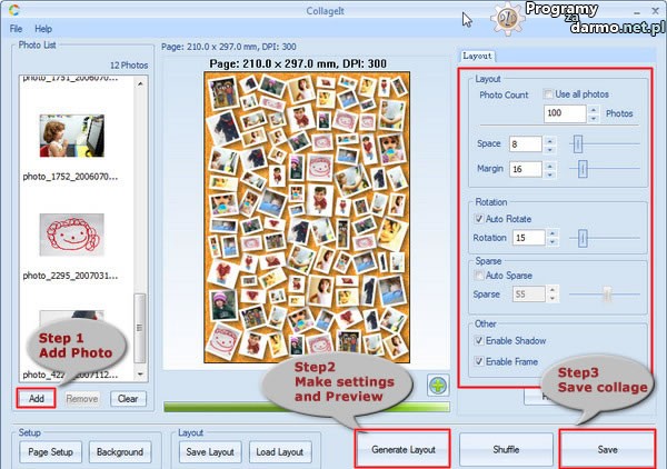 CollageIt Pro – to proste w obsłudze narzędzie przeznaczone do tworzenia kolaży ze zdjęć. Obsługa programu jest bardzo prosta, wybieramy zdjęcia następnie wygląd (w tym kolor tła, ułożenie fotografii i dodanie cienia) i zapisanie. Kolaż możemy zapisać do jednego z następujących formatów BMP, GIF, JPG, PNG i TIFF.