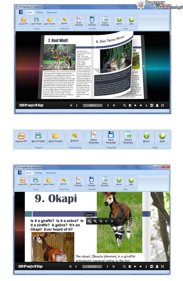 3DPageFlip for PowerPoint – to aplikacja za pomocą której w prosty sposób z plików Microsoft PowerPoint (PPT) utworzysz wspaniałe trójwymiarowe prezentacje w technologii Flash.Program pozwala tworzyć wirtualne książki, katalogi, broszury czy magazyny wraz z efektem przeglądania poszczególnych stron.