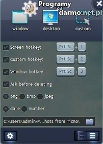 Obsługa programu jest bardzo prosta, po uruchomieniu Ticno Screenshooter w głównym oknie programu mamy do wyboru typy zrzutów ekranu jakie chcemy wykonać (wydzielony obszar, aktywne okno i pełny ekran) dodatkowo wyświetlone są podpowiedzi jak za pomocą skrótów klawiszowych tworzyć zrzuty ekranu, możemy także określić format w jakim mają być zapisywane zdjęcia ( PNG, JPG lub BMP ), dodać datę, czas oraz wybrać folder w którym będą zapisywane zdjęcia.