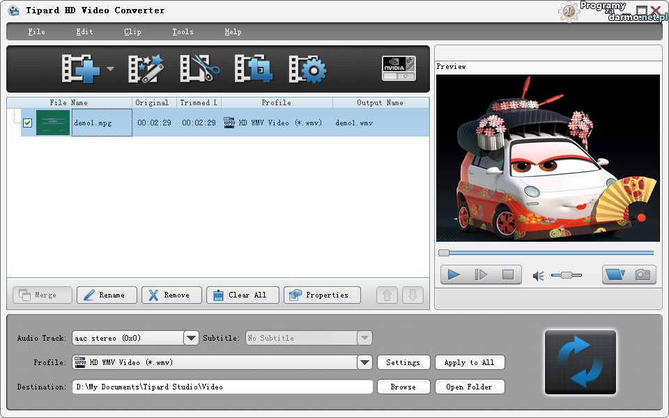 Tipard HD Video Converter – to profesjonalne narzędzie przeznaczone do konwertowania plików wideo, program obsługuje większość popularnych formatów ( także HD ).Tipard HD Video Converter umożliwia także wyciągnięcie ścieżki dźwiękowej z pliku wideo i zapisanie jej do formatu audio.