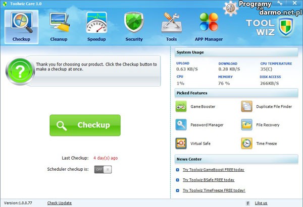 Toolwiz Care – to całkiem nowy, bezpłatny pakiet narzędzi zaprojektowany aby przyśpieszyć twój system Windows.W programie znajdziemy narzędzia do sprawdzania stanu systemu, oczyszczania systemu ze zbędnych plików śmieci, narzędzia do optymalizacji i wiele innych ( ponad 40 ).