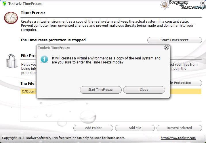 Zasada działania programu jest bardzo prosta, Toolwiz Time Freeze tworzy wirtualne środowisko w systemie Windows ( wirtualną kopię systemu ) na którym możecie bez obaw testować nowe gry, programy, infekować system złośliwym oprogramowaniem, ponieważ jest to system wirtualny.Wszystkie zmiany, ślady po programach zainstalowanych na wirtualnym systemie i zagrożeniach znikną po restarcie komputera.W programie znajdziemy także funkcję ochrony wybranych przez nas folderów.Chronione foldery nie mogą być modyfikowane i odczytywane, zapobiega to na przykład odczytywaniu twoich ważnych danych przez trojany czy wirusy.