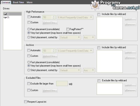 Program jest niesamowity…w dosłownym znaczeniu. Ilość możliwych scenariuszy defragmentacji, a przy tym dodatkowo własne „wariacje” na ich temat sprawa, że chyba nie ma bardziej rozbudowanego defragmentatora. Opcje pozwalają nie tylko np. na własny schemat kolorów, ale również na ułożenie plików wg swoich ustawień – określona ilość na zewnątrz dysku, a reszta wewnątrz, co przyspiesza działanie systemu i najczęściej używanych aplikacji.