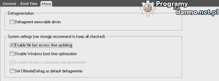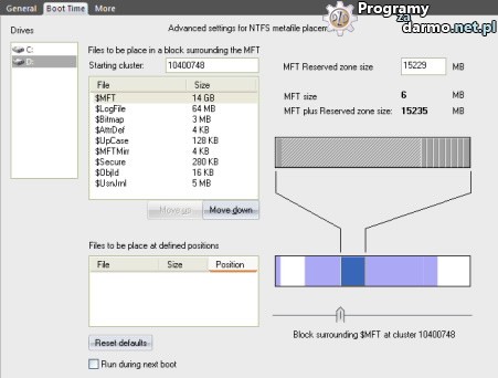 Kolejna część to „boot time”. Opcja ta pozwala na defragmentację plików systemowych oraz MFT.