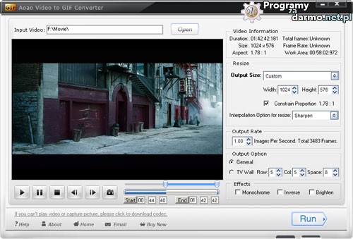 Video to GIF Converter – to proste w obsłudze narzędzie przeznaczone do konwersji plików wideo (poszczególnych klatek filmu) do pliku graficznego JPEG lub animacji GIF. Program obsługuje wszystkie popularne formaty wideo jak AVI, MPEG, WMV, DivX, RMVB itp.