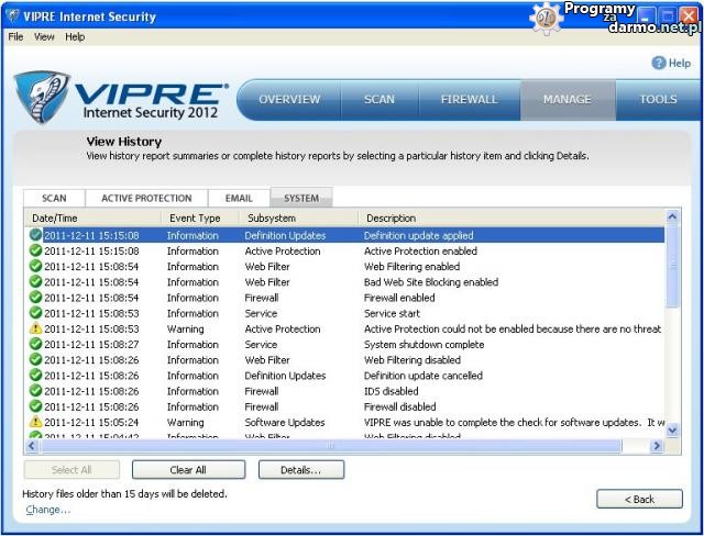 Szczegółowe informacje o działaniach wykonanych przez VIPRE Internet Security 2012 miedzy innymi takie jak aktualizacje, zablokowane niebezpieczne strony itp.