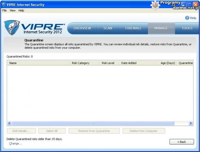 Quarantine – znajdziemy tu wszystko to co zostało poddane kwarantannie, możemy usunąć plik z kwarantanny ( w przypadku gdy program źle sklasyfikował plik ) oraz całkowicie usunąć plik z komputera.