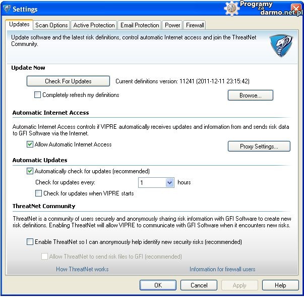 Na tej karcie możemy zaktualizować ręcznie program, odświeżyć definicje ( zostaną pobrane od nowa ) ,ustawić automatyczne sprawdzanie aktualizacji, sprawdzanie aktualizacji o wybranej godzinie, wgrać aktualizacje z z dysku czy innej lokalizacji w przypadku braku połączenia z internetem, włączyć lub wyłączyć automatyczny dostęp VIPRE Internet Security 2012 do internetu, ustawić sposób łączenia programu z internetem (np: poprzez proxy),ustawić sprawdzanie aktualizacji podczas uruchamiania programu i włączyć/wyłączyć technologię ThreatNet która jest pomocna w przypadku identyfikacji nieznanych jeszcze zagrożeń.