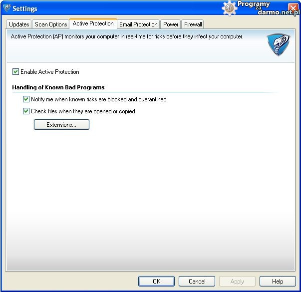 Zadaniem modułu Active Protection jest monitorowanie w czasie rzeczywistym systemu i ochrona przed zagrożeniami zanim spróbują zainfekować twój system, można tę funkcję włączyć lub wyłączyć ( domyślnie jest włączona i lepiej będzie jak tak pozostanie ), dodatkowo możemy włączyć lub wyłączyć wyświetlanie powiadomień w przypadku gdy program zablokuje lub podda kwarantannie podejrzane/niebezpieczne elementy, przywrócić ustawienia domyślne, oraz włączyć lub wyłączyć skanowanie danych podczas ich uruchamiania i kopiowania, funkcja ta może nieznacznie spowalniać wykonywanie operacji na komputerze, jednak zapewnia większe bezpieczeństwo.