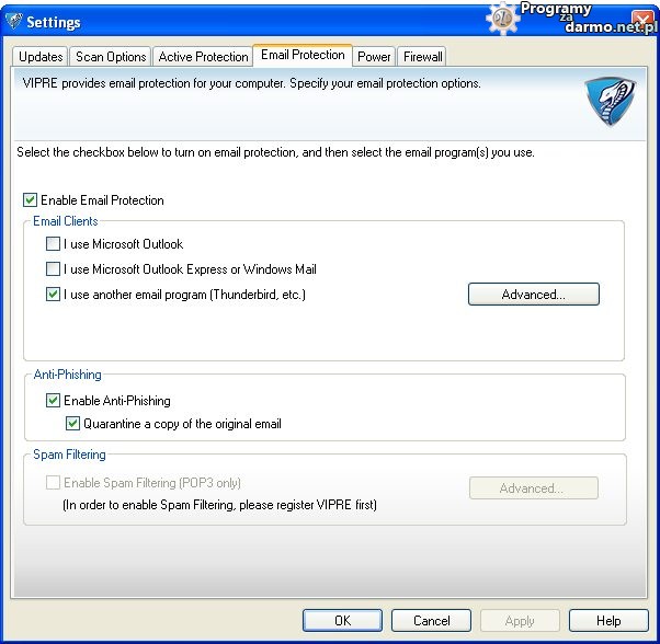 VIPRE Internet Security 2012 zapewnia kompleksową ochronę przed phishingiem, wirusami w wiadomościach e-mail, w pełni obsługuje popularne klienty poczty między innymi takie jak Outlook, Outlook Express, Windows Mail oraz każdy inny który który używa protokołów POP3 i SMTP.