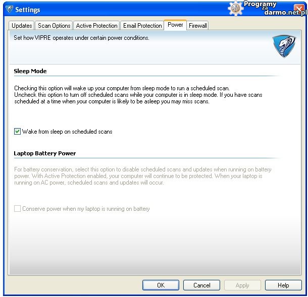 Tutaj możemy ustawić jak VIPRE Internet Security 2012 ma działać w określonych stanach zasilania.
