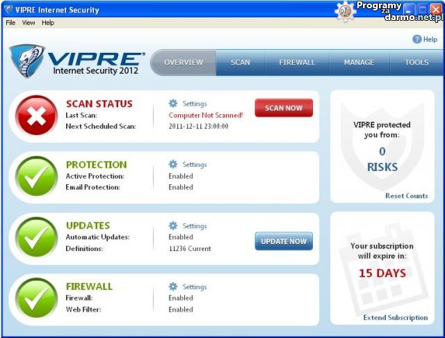 Na tej karcie wyświetlany jest stan modułów w jakie VIPRE Internet Security 2012, został wyposażony.Możemy tutaj wejść w ustawienia programu, przeskanować komputer czy zaktualizować bazy definicji wirusów ( wymusić ręczne pobranie aktualizacji ), dodatkowo na bieżąco wyświetlane są informacje o zablokowanych szkodliwych aplikacjach ( malware ) oraz pozostałych dni subskrypcji ( licencji ) na program.