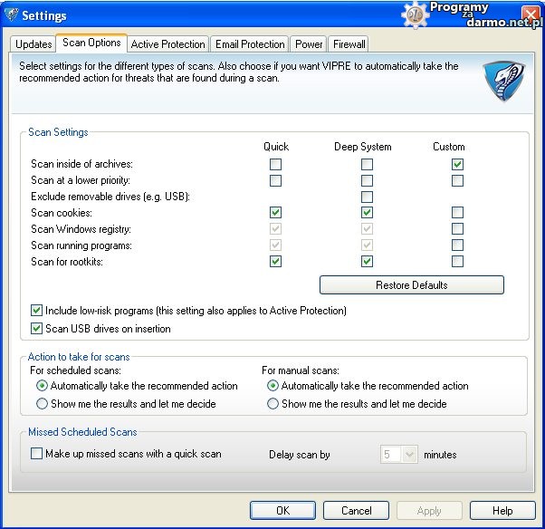 Na karcie Scan Options możemy dokładnie sprecyzować opcje dotyczące skanowania w tym skanowanie wewnątrz archiwów, skanowanie z niskim priorytetem (trwa dłużej ale mniej obciąża komputer), wykluczyć ze skanowania nośniki wymienne, ustawić skanowanie ciasteczek, skanowanie rejestru, skanowanie uruchomionych programów,włączyć lub wyłączyć skanowanie nośników wymiennych po podłączeniu oraz skanowanie w poszukiwaniu rootkitów.