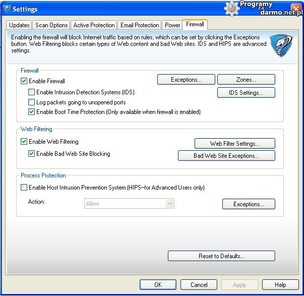 Process Protection (HIPS) czyli ochrona procesów i monitorowanie wykonywanych akcji/działań w systemie, bardzo przydatny moduł ale tylko dla użytkowników którzy mają pojęcie na co zezwalają a na co nie.Domyślnie ten moduł nie jest uruchomiony ( przeznaczony dla zaawansowanych użytkowników ). Możemy także wybrać rodzaj akcji jaka będzie wykonywana, dodać wyjątki oraz przywrócić domyślne ustawienia.