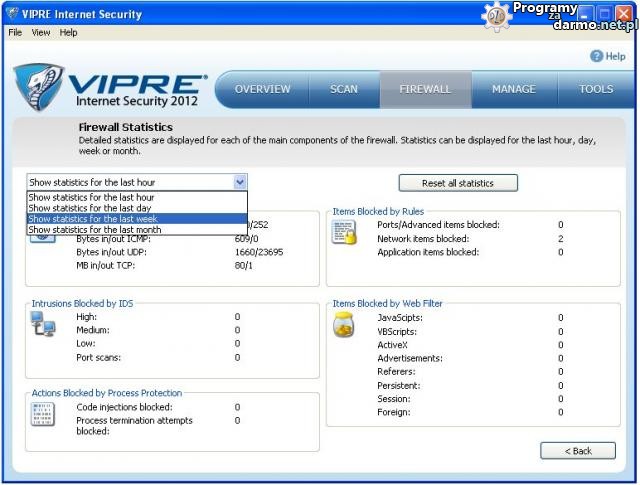 Firewall Statistic czyli szczegółowe informacje zapory sieciowej wbudowanej w program.Możemy tutaj podejrzeć co zostało zablokowane przez zaporę sieciową, IDS, filtrowanie sieci czy monitor procesów.