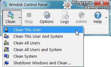 Po uruchomieniu programu, wystarczy kliknąć przycisk Clean gdzie możemy wybrać czyszczenie tylko dla bieżącego użytkownika, wszystkich użytkowników i całego systemu.