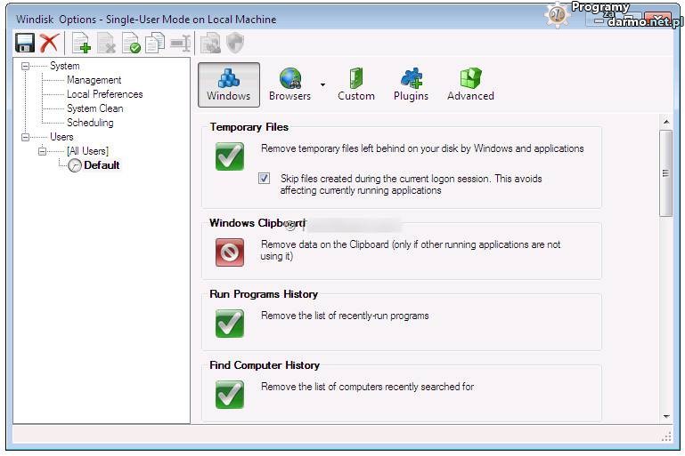 Windisk – to malutka, bezpłatna aplikacja która automatycznie podczas każdego wyłączenia komputera/wylogowania użytkownika wyszukuje i usuwa wszelkie pliki śmieci które niepotrzebnie zajmują miejsce na dysku twardym twojego komputera. Program usuwa między innymi pliki tymczasowe tworzone przez przeglądarki internetowe (Internet Explorer, Firefox, Chrome, Opera i Safari) podczas serfowania w sieci, historię ostatnio uruchamianych programów/dokumentów, pliki tymczasowe tworzone przez programy Adobe, Microsoft Office, Corel, Apple, Macromedia, ZIP, RAR i wiele innych dzięki czemu twój system jest zawsze w dobrej kondycji a co najważniejsze czyszczenie odbywa się automatycznie 😀