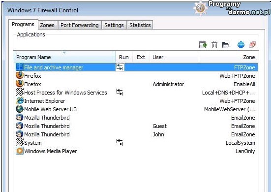 Interfejs programu Windows 7 Firewall Control jest bardzo intuicyjny dzięki czemu nawet początkujący użytkownicy nie będą mieli problemów z obsługą programu.