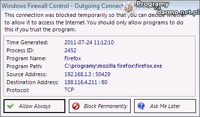 Windows Firewall Control jest programem portable ( jeden plik wykonywalny ) i nie trzeba go instalować, możemy ustawić aby uruchamiał się wraz ze startem systemu, posiada tryb Learning Mode ( program się uczy i wyświetla szczegółowe powiadomienia o zablokowanych połączeniach wychodzących dodatkowo pozwala użytkownikowi na „Allow Always” ( Zawsze Zezwalaj ) lub „Block Permanently” ( Zawsze Blokuj ) programów, pozwala zablokować konfigurację poprzez ustawienie hasła, importować i eksportować reguły, integruje się z menu kontekstowym (bardzo ułatwia tworzenie regułek) , wyświetla bieżące połączenia dla komputera i programów, w prosty sposób pozwala wyzerować ustawienia Zapory Systemowej do ustawień domyślnych.Program jest darmowy choć za drobną opłatą ( 10$ ) otrzymujemy dodatkowo nowe funkcje takie jak tworzenie regułek z menu kontekstowego ( PPM na pliku dla którego chcemy utworzyć regułkę, tryb Learning Mode ( program się uczy ), blokowanie konfiguracji hasłem , resetowanie zapomnianego hasła i dostęp do innych programów producenta 😀
