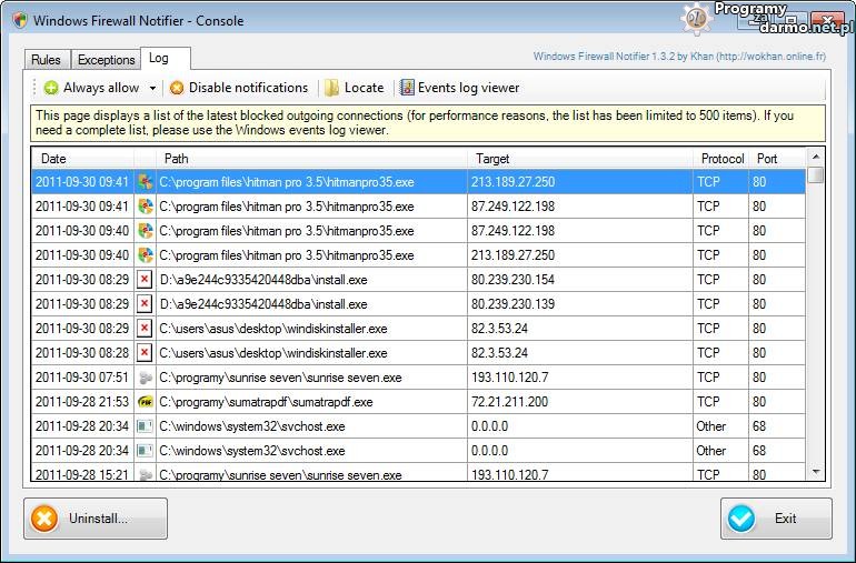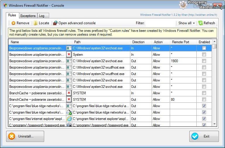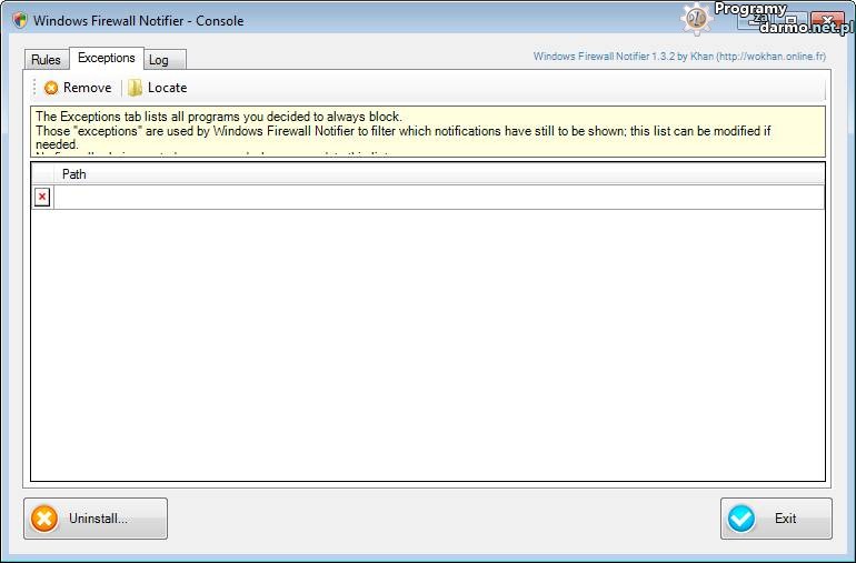 Windows Firewall Notifier pozwala także na dodawanie wykluczeń czyli aplikacji dla których mają być zawsze blokowane połączenia wychodzące i przychodzące.
